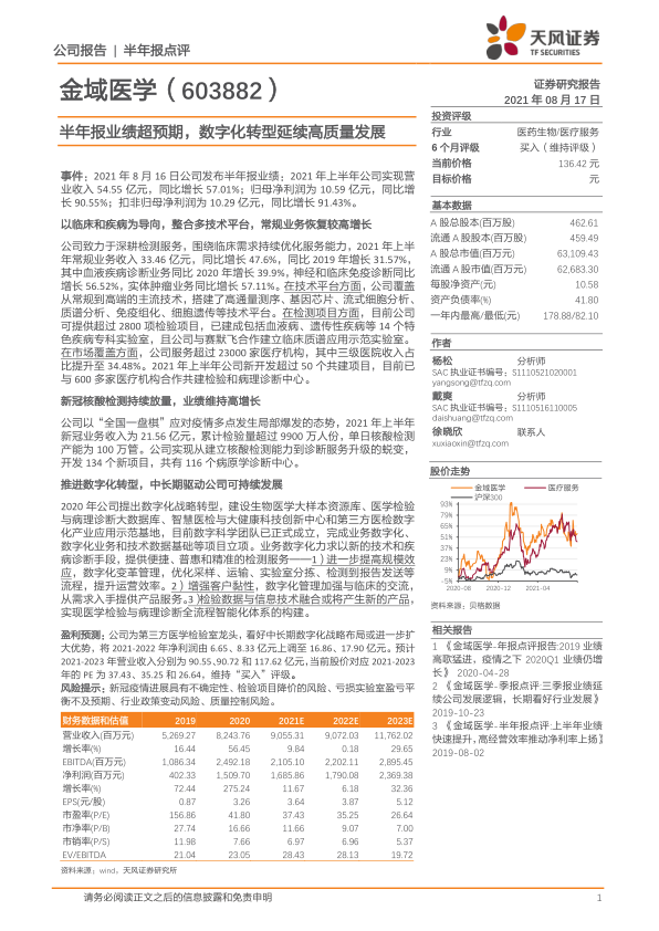 盈利预测:公司为第三方医学检验室龙头,看好中长期数字化战略布局或进一步扩大优势,将2021-2022年净利润由6.65、8.33亿元上调至16.86、17.90亿元。预计2021-2023年营业收入分别为90.55、90.72和117.62亿元,当前股价对应2021-2023年的PE为37.43、35.25和26.64,维持“买入”评级。