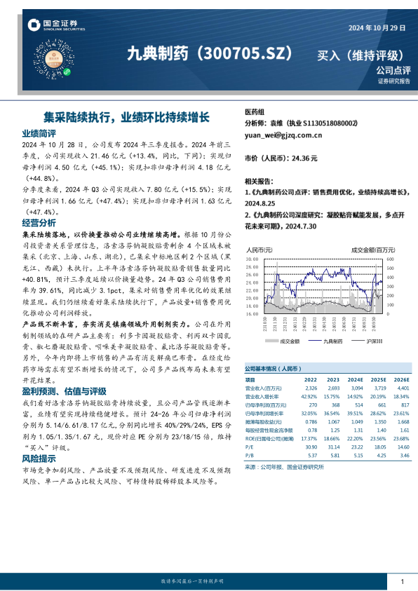九典制药2024年三季度业绩表现亮眼,受益于集采政策下的以价换量策略和销售费用率的优化。公司积极拓展产品线,未来业绩有望持续稳健增长。维持“买入”评级,但需关注市场竞争、产品放量、研发进度、单一产品依赖以及可转债转股等风险。