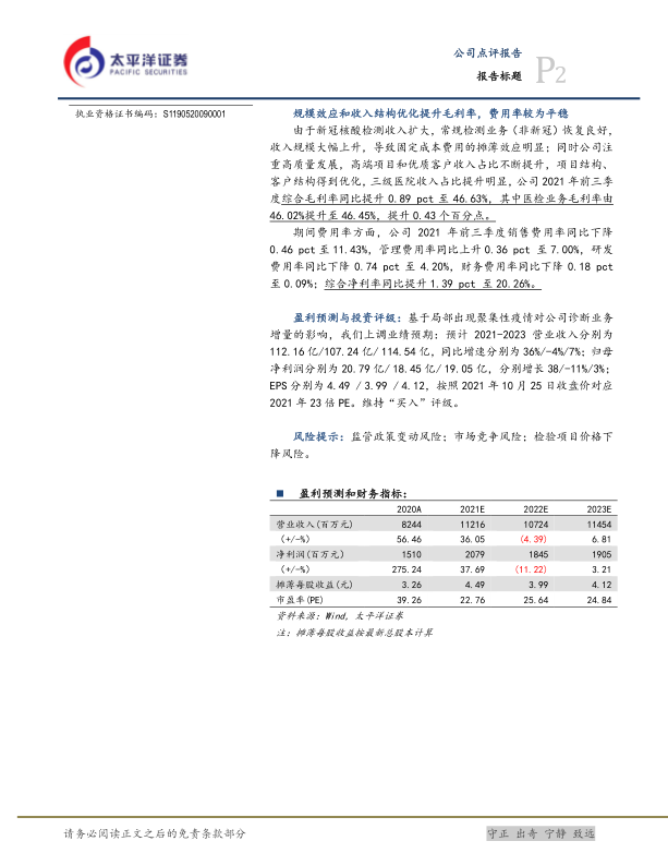 盈利预测与投资评级:基于局部出现聚集性疫情对公司诊断业务增量的影响,我们上调业绩预期:预计2021-2023营业收入分别为112.16亿/107.24亿/114.54亿,同比增速分别为36%/-4%/7%;归母净利润分别为20.79亿/18.45亿/19.05亿,分别增长38/-11%/3%;EPS分别为4.49/3.99/4.12,按照2021年10月25日收盘价对应2021年23倍PE。维持“买入”评级。