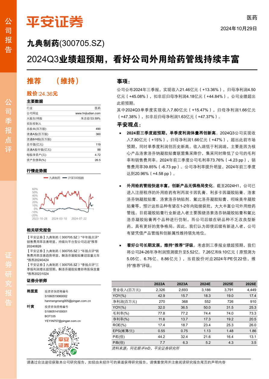 九典制药(300705)
