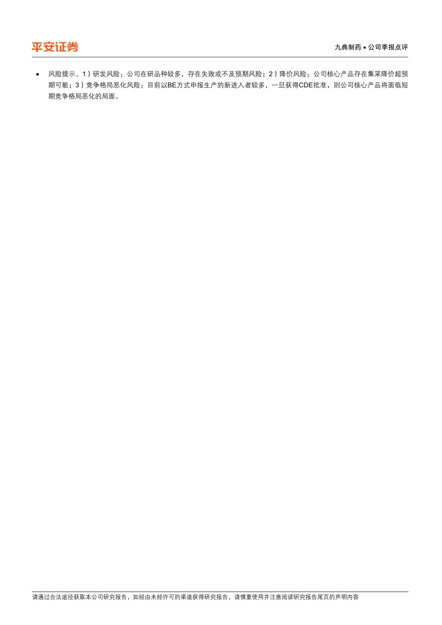 风险提示。1)研发风险:公司在研品种较多,存在失败或不及预期风险;2)降价风险:公司核心产品存在集采降价超预期可能;3)竞争格局恶化风险:目前以BE方式申报生产的新进入者较多,一旦获得CDE批准,则公司核心产品将面临短期竞争格局恶化的局面。