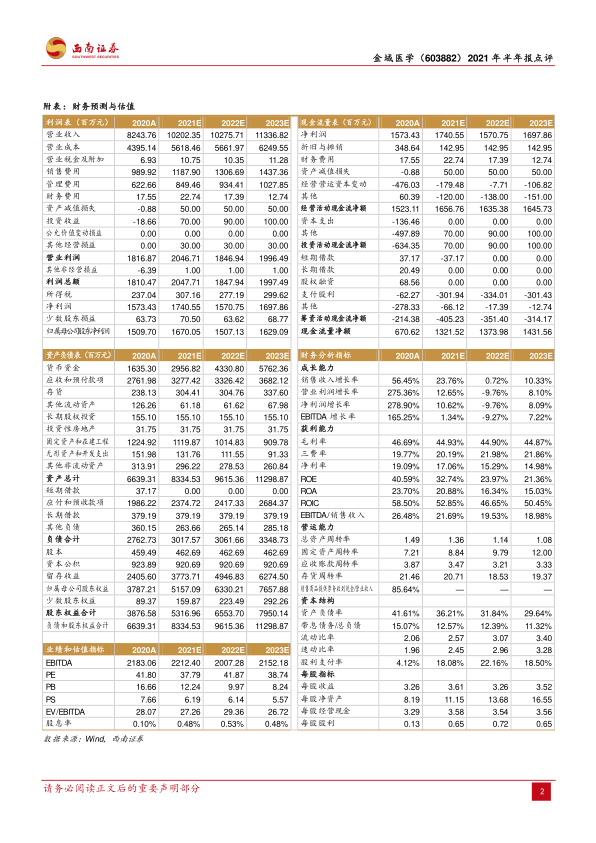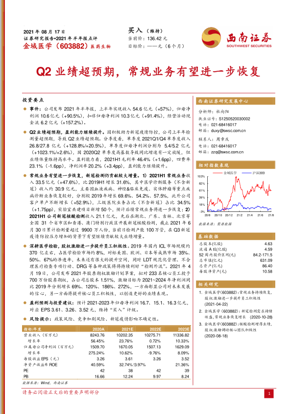 本报告对金域医学(603882)2021年半年报进行了深度分析,核心观点如下: