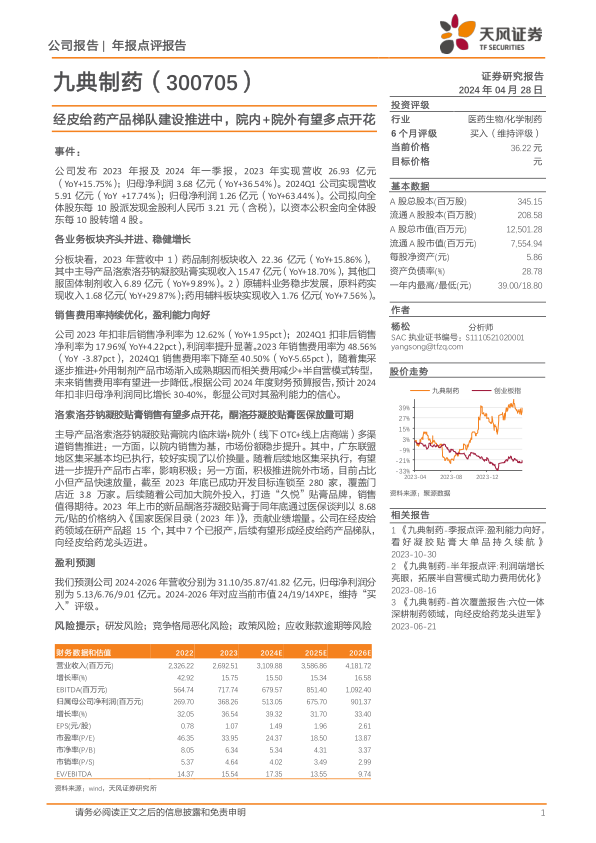 九典制药在2023年及2024年一季度表现出强劲的增长势头,各业务板块齐头并进,盈利能力显著提升。公司主导产品洛索洛芬钠凝胶贴膏通过多渠道销售,市场份额稳步提升,同时积极布局经皮给药领域,未来发展潜力巨大。维持“买入”评级,但需关注研发、竞争格局、政策及应收账款等风险。