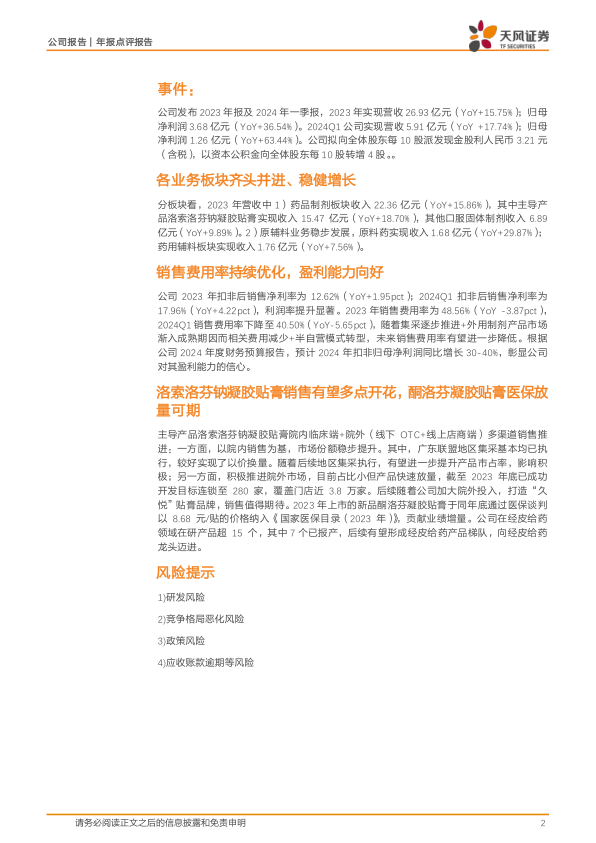 洛索洛芬钠凝胶贴膏销售有望多点开花,酮洛芬凝胶贴膏医保放量可期主导产品洛索洛芬钠凝胶贴膏院内临床端+院外(线下OTC+线上店商端)多渠道销售推进:一方面,以院内销售为基,市场份额稳步提升。其中,广东联盟地区集采基本均已执行,较好实现了以价换量。随着后续地区集采执行,有望进一步提升产品市占率,影响积极;另一方面,积极推进院外市场,目前占比小但产品快速放量,截至2023年底已成功开发目标连锁至280家,覆盖门店近3.8万家。后续随着公司加大院外投入,打造“久悦”贴膏品牌,销售值得期待。2023年上市的新品酮洛芬凝胶贴膏于同年底通过医保谈判以8.68元/贴的价格纳入《国家医保目录(2023年)》,贡献业绩增量。公司在经皮给药领域在研产品超15个,其中7个已报产,后续有望形成经皮给药产品梯队,向经皮给药龙头迈进。