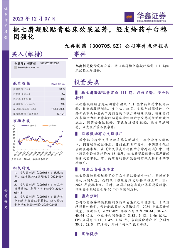 本报告分析了九典制药椒七麝凝胶贴膏III期临床试验的积极结果,强调了其在中药贴膏市场的潜力。同时,报告也分析了公司在经皮给药领域的布局和未来盈利预测,维持“买入”评级。投资者应关注销售、政策和质量等风险。