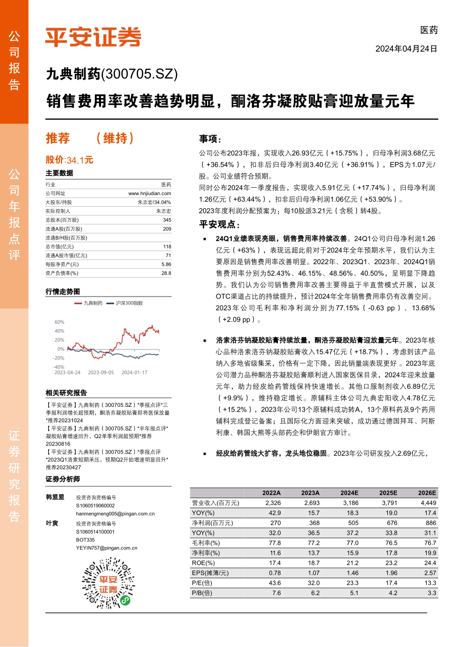 九典制药2023年业绩稳健增长,2024年一季度业绩超预期,销售费用率改善明显,盈利能力提升。核心品种洛索洛芬钠凝胶贴膏持续放量,酮洛芬凝胶贴膏迎来放量元年,经皮给药管线产品丰富,未来成长潜力巨大。平安证券上调了公司未来几年的盈利预测,维持“推荐”评级,认为当前估值具有较高的性价比。但同时也提示了研发风险、政策风险和产品放量不及预期风险。