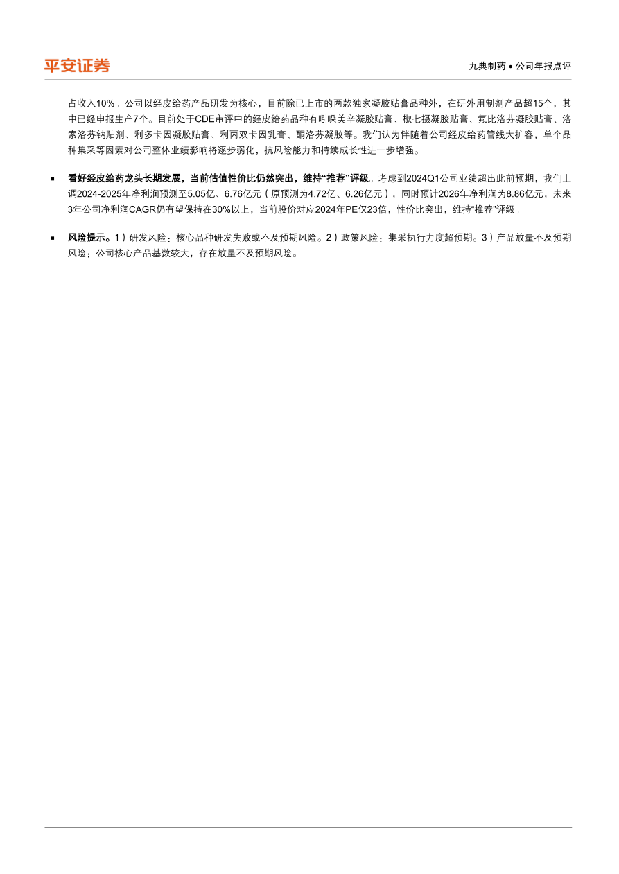 看好经皮给药龙头长期发展,当前估值性价比仍然突出,维持“推荐”评级。考虑到2024Q1公司业绩超出此前预期,我们上调2024-2025年净利润预测至5.05亿、6.76亿元(原预测为4.72亿、6.26亿元),同时预计2026年净利润为8.86亿元,未来3年公司净利润CAGR仍有望保持在30%以上,当前股价对应2024年PE仅23倍,性价比突出,维持“推荐”评级。