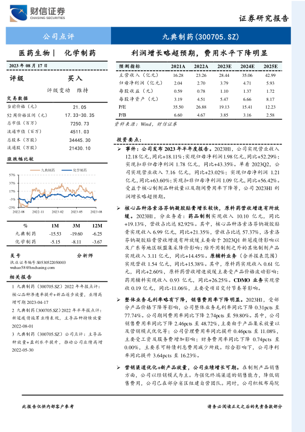 事件: 公司发布 2023 年半年度报告。 2023H1,公司实现营业收入12.18亿元,同比+18.11%;实现归母净利润 1.98亿元,同比+52.29%;实现扣非归母净利润 1.78 亿元,同比+43.35%。单看 2023Q2,公司实现营业收入 7.16 亿元,同比+23.02%; 实现归母净利润 1.21亿元,同比+63.60%;实现扣非归母净利润 1.09 亿元,同比+56.42%。受益于核心制剂品种放量以及期间费用率下降等, 公司 2023H1 利润增长略超预期。