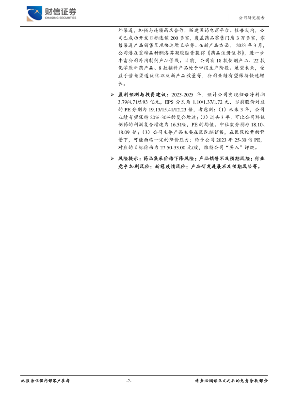 考虑到公司未来三年业绩有望保持20%-30%的复合增速,且可比公司羚锐制药过去三年利润复合增速为16.51%,PE均值和中位数分别为18.10倍和18.09倍,以及公司主导产品在医院端销售可能面临医保控费带来的降价压力,财信证券给予公司2023年25-30倍PE,对应的目标价格为27.50-33.00元/股,并维持“买入”评级。