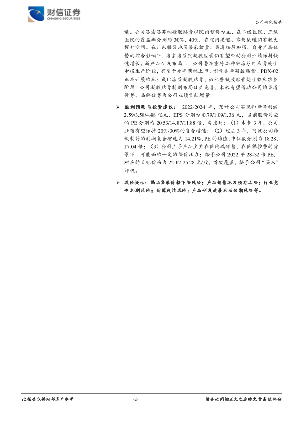盈利预测与投资建议:2022-2024年,预计公司实现归母净利润2.59/3.58/4.48亿元,EPS分别为0.79/1.09/1.36元,当前股价对应的PE分别为20.53/14.87/11.88倍,考虑到:(1)未来3年,公司业绩有望保持20%-30%的复合增速;(2)过去3年,可比公司羚锐制药的利润复合增速为14.21%,PE的均值、中位数分别为18.28、17.04倍;(3)公司主导产品主要在医院端销售,在医保控费的背景下,可能面临一定的降价压力;给予公司2022年28-32倍PE,对应的目标价格为22.12-25.28元/股,首次覆盖,给予公司“买入”评级。