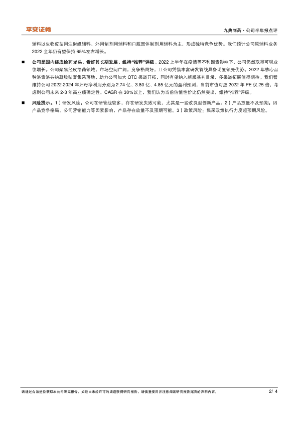 公司是国内经皮给药龙头,看好其长期发展,维持“推荐”评级。2022上半年在疫情等不利因素影响下,公司仍然取得可观业绩增长。公司聚焦经皮给药领域,市场空间广阔,竞争格局好,且公司凭借丰富研发管线具备明显领先优势。2022年核心品种洛索洛芬钠凝胶贴膏集采落地,助力公司加大OTC渠道开拓,同时有望纳入新版基药目录,多渠道拓展值得期待。我们暂维持公司2022-2024年归母净利润分别为2.74亿、3.80亿、4.85亿元的盈利预测,当前市值对应2022年PE仅25倍,考虑到公司未来2-3年高业绩确定性,CAGR在30%以上,我们认为当前估值性价比仍然突出,维持“推荐”评级。