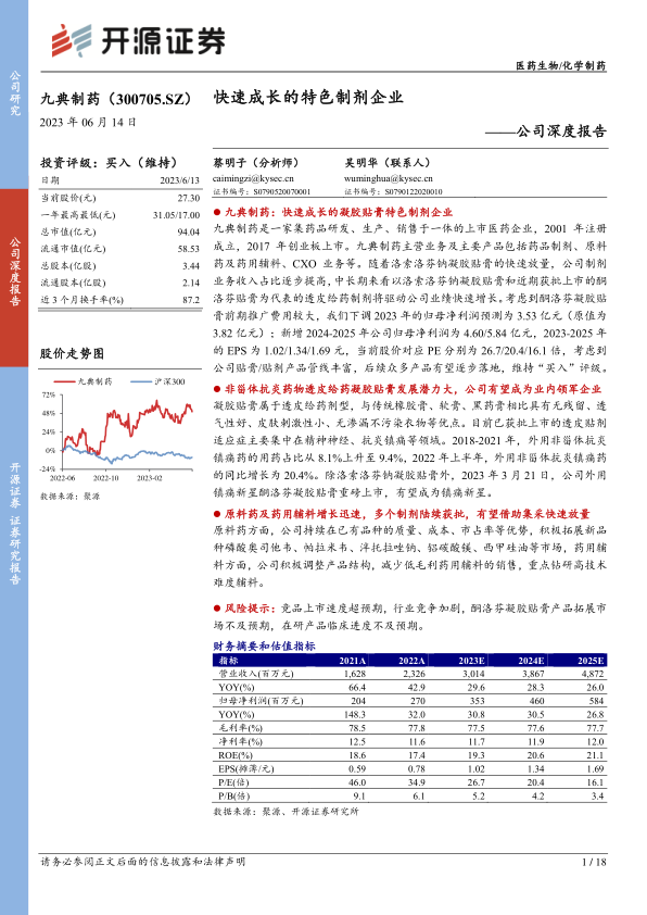 九典制药是一家集药品研发、生产、销售于一体的上市医药企业,2001年注册成立,2017年创业板上市。九典制药主营业务及主要产品包括药品制剂、原料药及药用辅料、CXO业务等。随着洛索洛芬钠凝胶贴膏的快速放量,公司制剂业务收入占比逐步提高,中长期来看以洛索洛芬钠凝胶贴膏和近期获批上市的酮洛芬贴膏为代表的透皮给药制剂将驱动公司业绩快速增长。考虑到酮洛芬凝胶贴膏前期推广费用较大,我们下调2023年的归母净利润预测为3.53亿元(原值为3.82亿元);新增2024-2025年公司归母净利润为4.60/5.84亿元,2023-2025年的EPS为1.02/1.34/1.69元,当前股价对应PE分别为26.7/20.4/16.1倍,考虑到公司贴膏/贴剂产品管线丰富,后续众多产品有望逐步落地,维持“买入”评级。