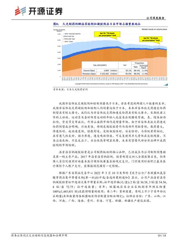 凝胶贴膏属于透皮给药剂型,与传统橡胶膏、软膏、黑药膏相比具有无残留、透气性好、皮肤刺激性小、无渗漏不污染衣物等优点。目前已获批上市的透皮贴剂适应症主要集中在精神神经、抗炎镇痛等领域。2018-2021年,外用非甾体抗炎镇痛药的用药占比从8.1%上升至9.4%,2022年上半年,外用非甾体抗炎镇痛药的同比增长为20.4%。除洛索洛芬钠凝胶贴膏外,2023年3月21日,公司外用镇痛新星酮洛芬凝胶贴膏重磅上市,有望成为镇痛新星。