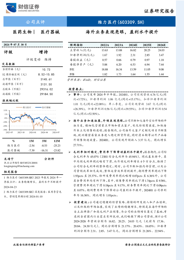 财信证券维持维力医疗“增持”评级。考虑到当前国内行业需求可能存在的扰动,财信证券略微下调了公司2024-2026年的营收预测,分别为16.82亿元、20.25亿元和24.03亿元(此前预测为17.36亿元、20.84亿元、24.30亿元),同比分别增长21.17%、20.43%、18.65%。归母净利润预测分别为2.31亿元、2.85亿元和3.47亿元,同比分别增长21.26%、22.94%、21.77%。对应EPS分别为0.79元、0.97元和1.18元,当前股价对应PE分别为13.59倍、11.05倍和9.08倍。公司通过稳健的经营策略、持续的研发投入和产品创新,以及积极的市场拓展,特别是海外市场的自主品牌推广和高毛利产品销售,为业绩增长奠定了坚实基础。