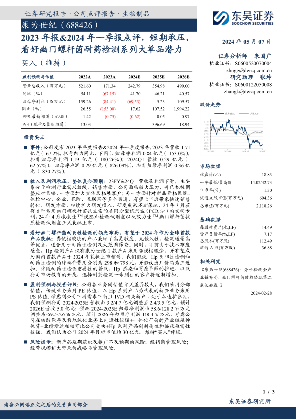 本报告分析了康为世纪2023年年报和2024年一季报,指出公司短期内面临营收和利润的压力,主要由于分子检测行业需求放缓。但公司积极调整策略,加大研发投入,特别是在幽门螺杆菌耐药性检测领域具有领先布局,有望成为新的增长点。