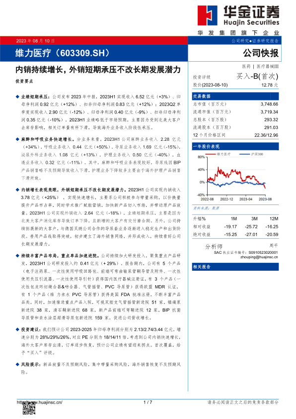 维力医疗2023年上半年业绩受海外大客户去库存影响短期承压,但内销市场表现出强劲增长势头,得益于积极的市场策略和产品推广。公司持续加大研发投入,丰富产品线,并加速重点产品入院,为未来增长奠定基础。麻醉和呼吸等高增长业务将持续贡献业绩。随着海外大客户库存出清和订单逐步恢复,公司业绩有望迎来拐点。基于内销的快速增长和长期发展潜力,报告首次覆盖并给予“买入”评级。主要风险包括新品放量不及预期、集中带量采购以及海外销售恢复不及预期。