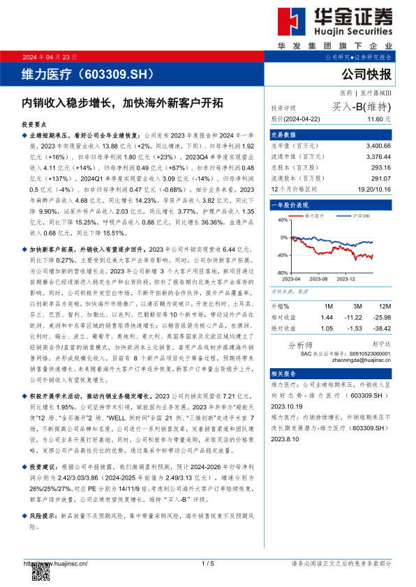 加快新客户拓展,外销收入有望逐步回升。2023年公司外销实现营收6.44亿元,同比下降0.27%,主要受到北美大客户去库存影响。同时,公司加快新客户拓展,为公司增加新的营收增长点。2023年公司新增3个大客户项目落地,新项目通过前期磨合已经逐渐进入稳定生产和出货阶段,弥补了报告期内北美大客户去库存的影响。同时,公司积极开发空白市场,不断开拓新的合作伙伴,提升产品覆盖率。以创新单品为突破,加快海外市场推广。以清石鞘为突破口,开发比利时、土耳其、芬兰、巴西、智利、加勒比、以色列、巴勒斯坦等10个新市场,带动泌外产品在欧洲、美洲和中东等区域的销售取得快速增长;以精密尿袋为核心产品,在澳洲、比利时、瑞士、波兰、葡萄牙、奥地利、意大利、英国等国家及北欧区域均建立了经销商合作/直营的销售模式,加快欧洲本土化销售。兽用产品线初步搭建海外销售网络,并形成规模化收入,目前有8个新产品项目处于筹备过程,预期将带来销售量快速增长。未来随着海外大客户订单逐步恢复,新客户订单量出货稳步上升,公司外销收入有望恢复增长。