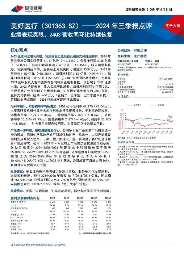 美好医疗2024年第三季度业绩表现强劲,营收实现显著的同环比增长,主要得益于去年同期低基数效应的消除和核心业务的持续恢复。尽管前三季度利润端受到汇兑损失和股份支付费用的短期影响,但若剔除这些非经常性因素,公司盈利能力呈现良好态势。毛利率的提升、全球产能的持续扩张以及股权激励计划的推出,均体现了公司稳健的经营策略和对未来增长的坚定信心。鉴于基石业务的企稳和多元化发展的顺利,分析师维持“优于大市”评级,并预计公司未来三年营收和净利润将保持23%-25%的复合增长。投资者需关注大客户依赖、汇率波动及新业务拓展不及预期等潜在风险。