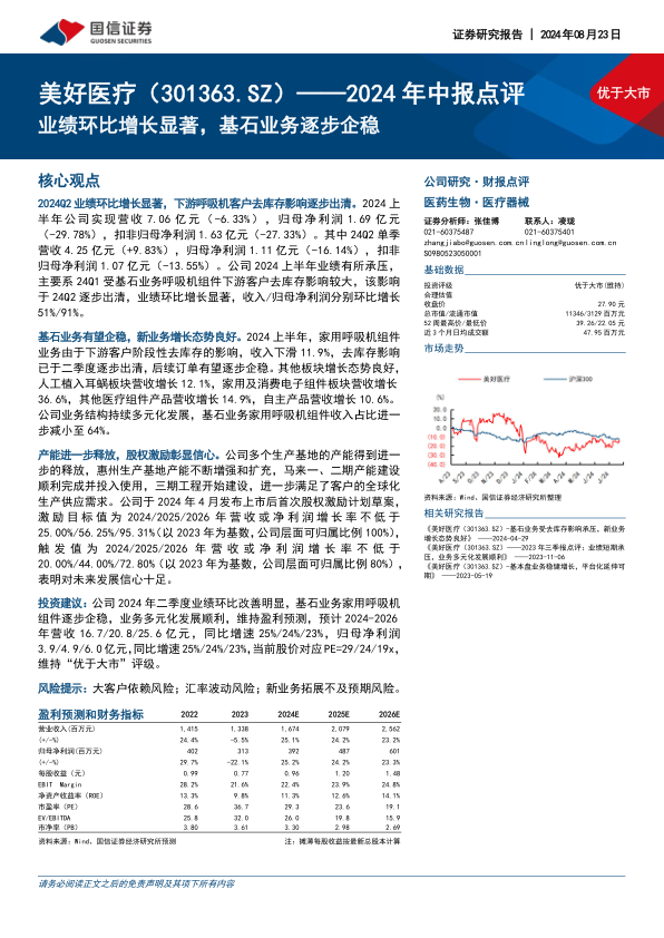 投资建议:公司2024年二季度业绩环比改善明显,基石业务家用呼吸机组件逐步企稳,业务多元化发展顺利,维持盈利预测,预计2024-2026年营收16.7/20.8/25.6亿元,同比增速25%/24%/23%,归母净利润3.9/4.9/6.0亿元,同比增速25%/24%/23%,当前股价对应PE=29/24/19x,维持“优于大市”评级。