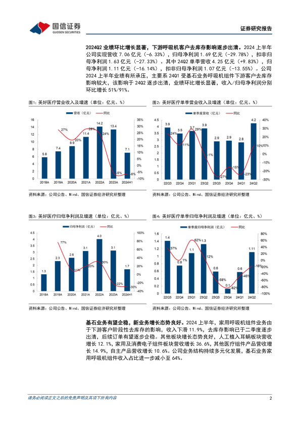 本报告的核心观点围绕美好医疗2024年中报展开,指出公司二季度业绩环比显著增长,主要受益于呼吸机组件下游客户去库存影响的逐步消除。同时,报告强调了公司业务多元化发展的良好态势,以及产能释放和股权激励对未来发展的积极影响。