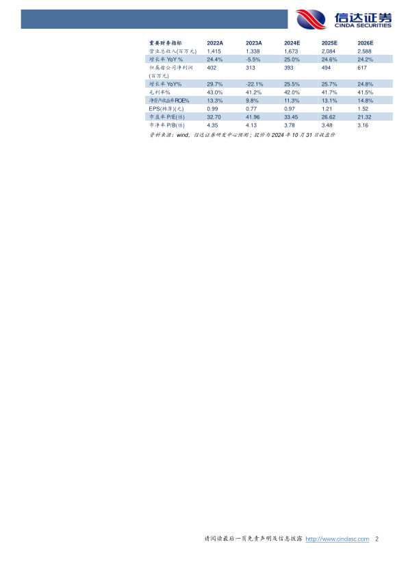 盈利预测及投资评级:我们预计公司2024-2026年营业收入分别为16.73、20.84、25.88亿元,同比增速分别为25.0%、24.6%、24.2%,实现归母净利润为3.93、4.94、6.17亿元,同比分别增长25.5%、25.7%、24.8%,对应当前股价PE分别为33、27、21倍,维持公司“买入”投资评级。