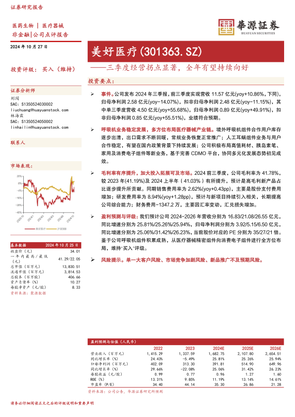 本报告分析了美好医疗2024年三季报,指出公司三季度经营拐点显著,业绩符合预期。公司在呼吸机业务稳定发展的基础上,积极布局多元化医疗器械产业链,毛利率有序提升,加大投入拓展市场。维持公司2024-2026年营收及归母净利润的预测,维持“买入”评级,但同时提示了单一大客户风险、市场竞争加剧风险以及新品推广不及预期风险。