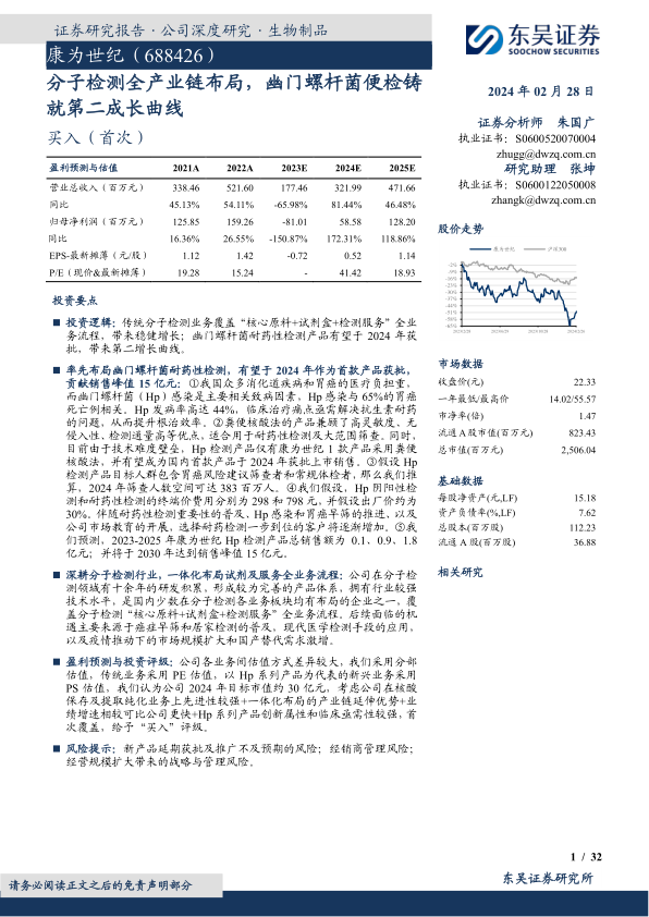 康为世纪凭借其在分子检测领域“核心原料+试剂盒+检测服务”的全产业链一体化布局,在核酸保存及提取纯化等传统优势业务上保持稳健发展,并积极通过高研发投入拓展新兴业务。公司率先布局的幽门螺杆菌耐药性粪便核酸检测产品,有望于2024年获批上市,成为其重要的第二增长曲线,预计将带来显著的业绩增量,销售峰值可达14.5亿元。尽管短期内受新冠业务退出影响业绩承压,但公司在国产替代、癌症早筛和居家检测普及的行业机遇下,凭借其技术先进性和市场领先地位,未来增长潜力巨大。报告基于分部估值法,给予公司“买入”评级,目标市值37亿元,体现了对其创新能力和市场前景的专业认可。