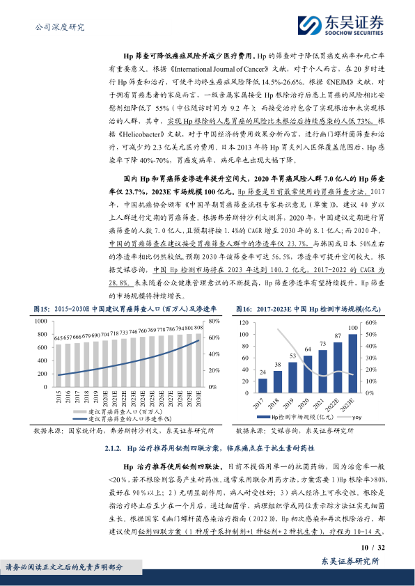 胃癌是我国高发癌症,2016年新发病例48万,位居第三。幽门螺杆菌(Hp)感染是胃癌的主要致病因素,与64.84%的胃癌新发病例和64.91%的胃癌死亡例相关。中国Hp平均发病率高达44.2%。Hp筛查对降低胃癌发病率和死亡率具有重要意义。2020年,中国建议定期进行胃癌筛查的人数达7.0亿人,但筛查渗透率仅为23.7%,远低于韩国或日本的50%,提升空间巨大。根据艾媒咨询,中国Hp检测市场规模在2023年预计达到100.2亿元,2017-2022年复合年增长率(CAGR)为28.8%。