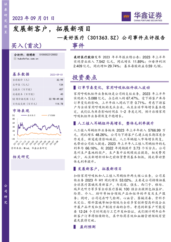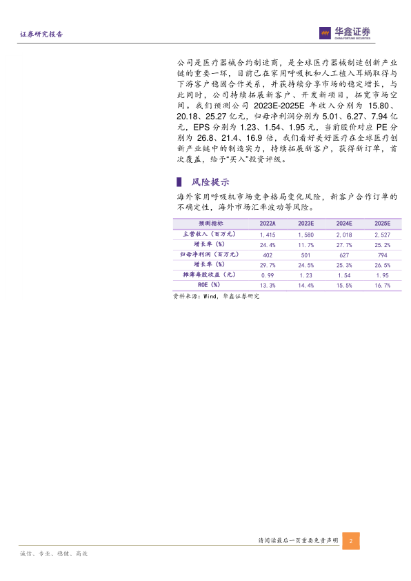 公司是医疗器械合约制造商,是全球医疗器械制造创新产业链的重要一环,目前已在家用呼吸机和人工植入耳蜗取得与下游客户稳固合作关系,并获持续分享市场的稳定增长,与此同时,公司持续拓展新客户、开发新项目,拓宽市场空间。我们预测公司2023E-2025E年收入分别为15.80、20.18、25.27亿元,归母净利润分别为5.01、6.27、7.94亿元,EPS分别为1.23、1.54、1.95元,当前股价对应PE分别为26.8、21.4、16.9倍,我们看好美好医疗在全球医疗创新产业链中的制造实力,持续拓展新客户,获得新订单,首次覆盖,给予“买入”投资评级。
