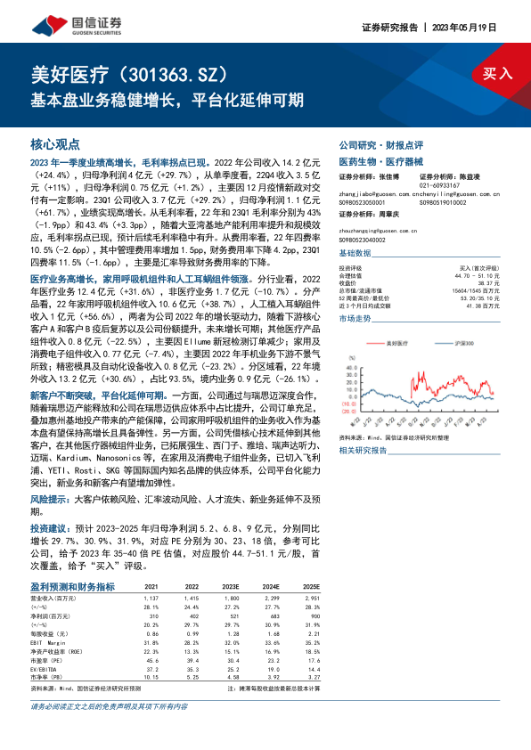 美好医疗在2023年第一季度展现出强劲的业绩增长势头,归母净利润同比大增61.7%,且毛利率已现拐点,盈利能力持续改善。公司核心医疗业务,特别是家用呼吸机组件和人工植入耳蜗组件,作为基本盘业务保持稳健高增长,得益于与全球领先客户的深度合作及市场份额的提升。同时,美好医疗凭借其在精密制造领域的技术优势,积极拓展其他医疗器械组件和家用及消费电子组件市场,成功切入多个国际知名品牌供应链,展现出强大的平台化延伸能力和未来增长潜力。尽管面临大客户依赖、汇率波动、人才流失及新业务拓展不确定性等风险,但分析师预计公司未来三年净利润将保持30%以上的复合增长,首次覆盖给予“买入”评级,并设定了明确的目标股价区间。