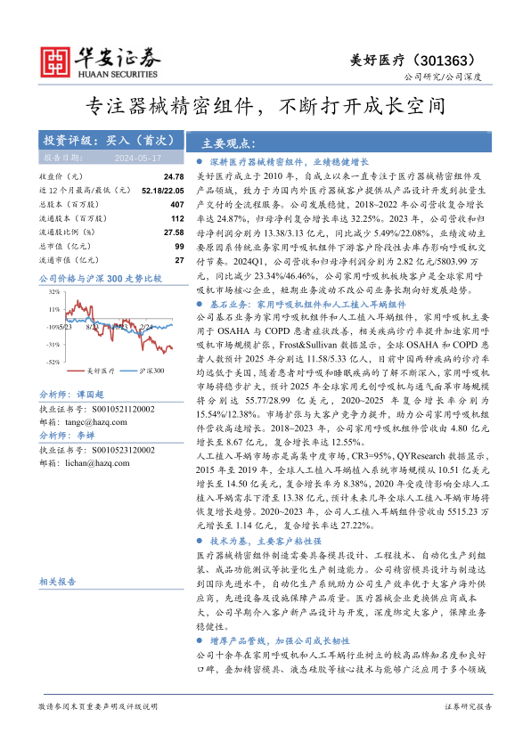 考虑到美好医疗作为国内器械精密组件的领先企业,技术沉淀深厚,客户合作关系稳固,华安证券首次覆盖并给予“买入”评级。