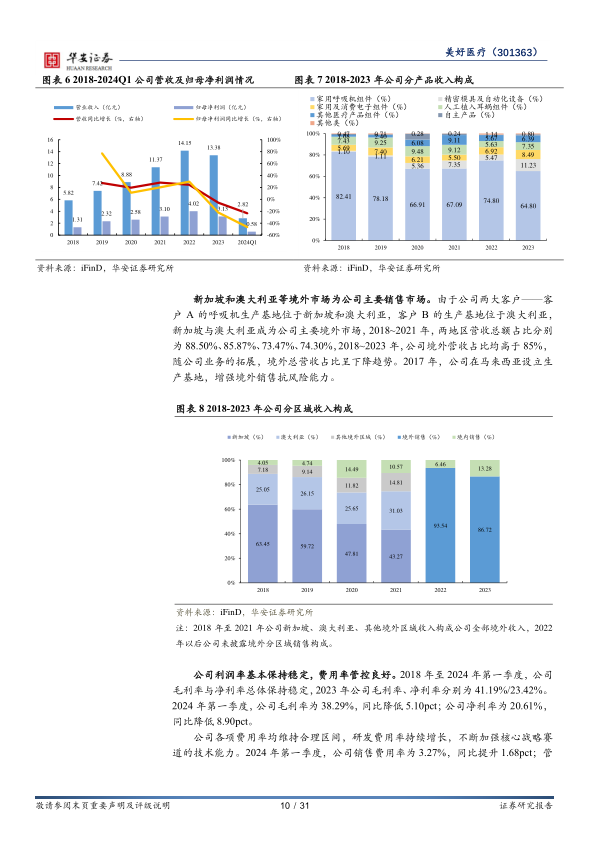 家用呼吸机组件是公司主要收入来源,2018-2023年营收占比分别为82.41%、78.18%、66.91%、67.09%、74.80%、64.80%。随着新业务拓展,其他医疗产品组件、家用及消费电子组件等在收入构成中的占比不断提升,显示出多元化业务布局的初步成效。公司主要销售市场为新加坡和澳大利亚等境外地区,2018-2023年境外营收占比均高于85%。公司利润率基本保持稳定,2023年毛利率和净利率分别为41.19%和23.42%。各项费用率管控良好,其中研发费用率持续增长,2024年第一季度达到8.07%,体现了公司对技术能力的持续投入。
