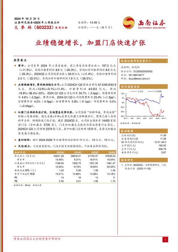 本报告对大参林(603233)2024年三季报进行了深度分析,核心观点如下: