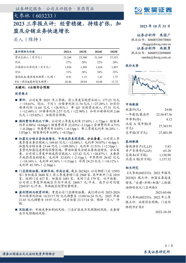 大参林2023年三季报显示公司经营稳健,业绩符合预期,加盟及分销业务快速增长成为亮点。公司通过持续拓展门店,深耕华南市场,并积极布局全国。分析师调整了盈利预测,维持“买入”评级,但同时也提示了市场竞争加剧、门店扩张或不及预期以及业务增长不及预期的风险。