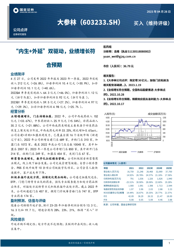 业绩稳健增长,门店持续拓展。2022年,公司中西成药收入152亿元(+33.67%),中参药材收入25.9亿元(+5.04%),非药品收入30.2亿元(+21.88%)。公司中西成药类增速主要来源于四类药品恢复上架及处方外流,中西成药毛利率33.25%,同比增加0.67pct。公司自建+并购+加盟共同发力,已覆盖全国16个省级市场(新进辽宁省),2022年公司新增自建门店689家,并购门店310家,加盟门店1072家。截至2022年底公司门店总数10045家,其中加盟店2007家;2023年一季度公司净增门店850家,其中新开门店214家,收购门店249家,加盟店454家,关闭门店67家。