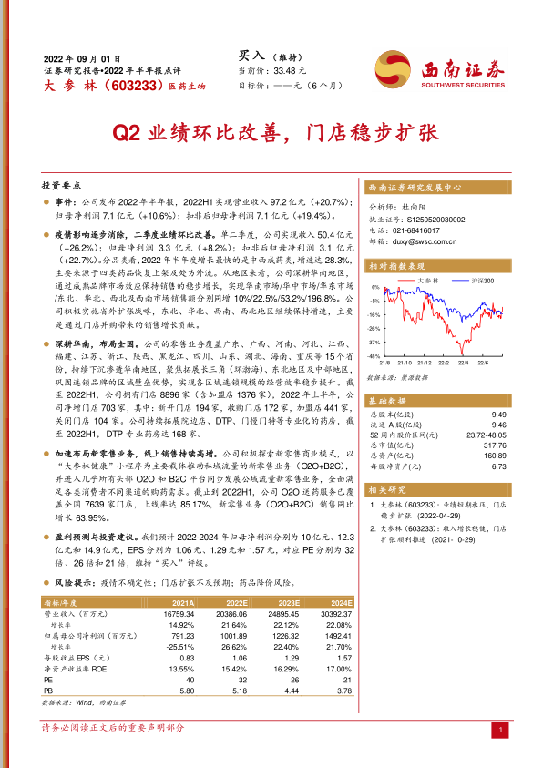 本报告分析了大参林(603233)2022年半年度报告,核心观点如下: