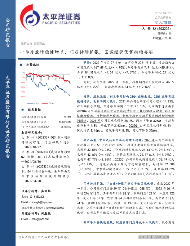 分产品看, 中西成药和中参药材增长稳健。 2021 年公司中西成药实现收入 113.53 亿元(+25.05%),增速主要源自非处方药销售增长,毛利率 32.58%(+0.03%),中参药材实现收入 24.61 亿元(+13.4%),毛利率 42.69%(+4.47%),非药品实现收入 24.77 亿元(-17.79%),毛利率 47.77%(-2.26%)。 2022Q1 公司中西成药实现收入 33.19 亿元( +20.72%),增速主要源自非处方药销售增长,毛利率 32.58%(+0.03%),中参药材实现收入 5.72 亿元(-2.5%),毛利率 43.02%(+3.76%),非药品实现收入 6.17 亿元(+0.33%),毛利率 53%(-1.8%)。