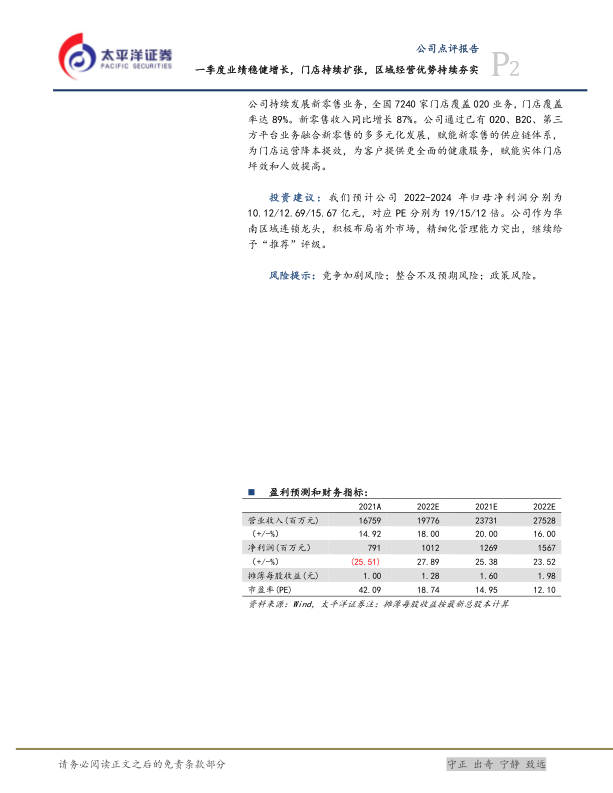 投资建议: 我们预计公司 2022-2024 年归母净利润分别为10.12/12.69/15.67 亿元,对应 PE 分别为 19/15/12 倍。 公司作为华南区域连锁龙头,积极布局省外市场,精细化管理能力突出, 继续给予“推荐”评级。