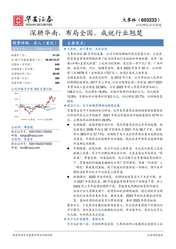 中国药店行业正受益于长期连锁化率提升、中期处方外流加速以及短期疫情防控政策调整后的市场复苏等多重利好。大参林通过集中化扩张、专业化服务升级和多元化新零售布局,全面提升了核心竞争力,有望持续把握行业发展机遇,实现可持续增长。