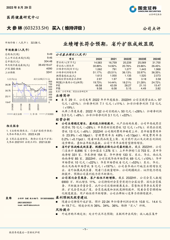 大参林2022年半年度报告显示公司业绩增长符合预期,省外扩张成效显著。公司通过优化产品结构、提升盈利能力、深化会员服务以及积极进行省外扩张,实现了业绩的稳定增长。国金证券维持对大参林的“买入”评级,并预测公司未来几年将保持较高的盈利增长。但同时也提示了外延并购、处方外流、互联网冲击以及收入地区集中等风险。