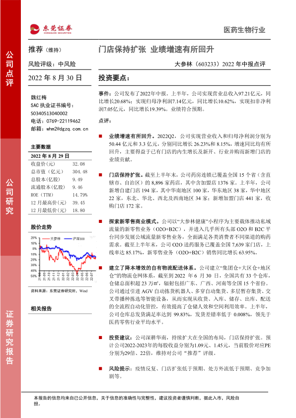 本报告分析了大参林(603233)2022年中报,核心观点如下: