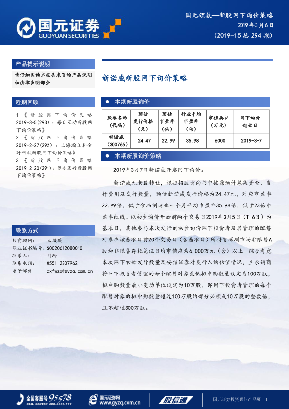 本报告对新股新诺威的网下询价策略进行了分析,包括公司基本面、发行价格预估、市盈率等关键信息。同时,报告也回顾了近期其他新股的询价情况,并详细说明了网下询价的规则。此外,报告还强调了新股申购的风险,并声明报告内容仅供参考,不构成投资建议,旨在为投资者提供客观的信息参考,并规避潜在的法律风险。