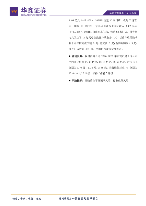 华南地区稳步发展,全国扩张持续推进。从区域增长情况来看,报告期内,华南地区实现收入62.95亿元(+9.59%),2021H1自建543家门店,加盟202家门店,二季度广东省疫情较为严重,预计对当期业绩产生一定负面影响,收入增速有所放缓;华中地区实现收入8.09亿元(+59.03%),2021H1自建8家门店,收购69家门店,加盟19家门店;华东地区收入4.08亿元(+17.45%),2021H1自建30家门店,收购57家门店,加盟19家门店;东北华北及西北地区收入3.02亿元(+49.37%),2021H1自建8家门店,收购63家门店。报告期内共发生了17起同行业投资并购业务,其中以前年度并购项目于本年度完成交割5起,待交割3起;新签并购项目9起,涉及门店数为409家,全国扩张步伐持续推进。
