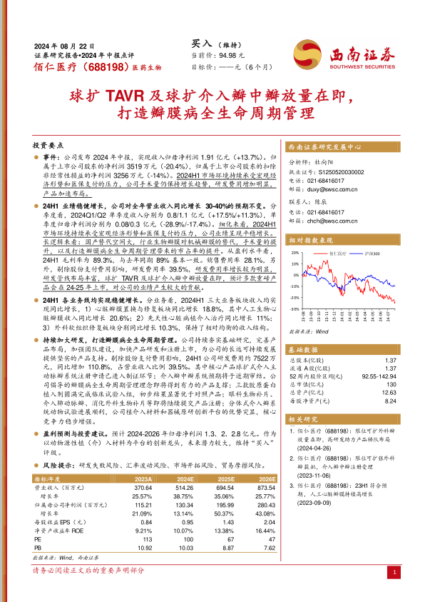 佰仁医疗2024年中报显示,公司在宏观经济和医保支付压力下仍保持稳健增长,并对全年营收增长抱有乐观预期。
