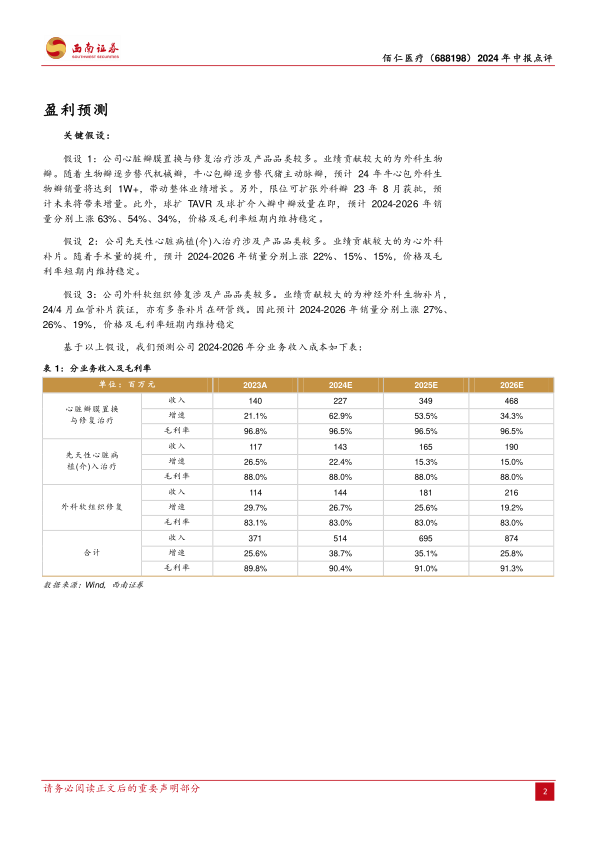 盈利预测与投资建议。预计2024-2026年归母净利润1.3、2、2.8亿元。作为以动物源性植(介)入材料为平台的创新龙头,未来潜力较大,维持“买入”评级。