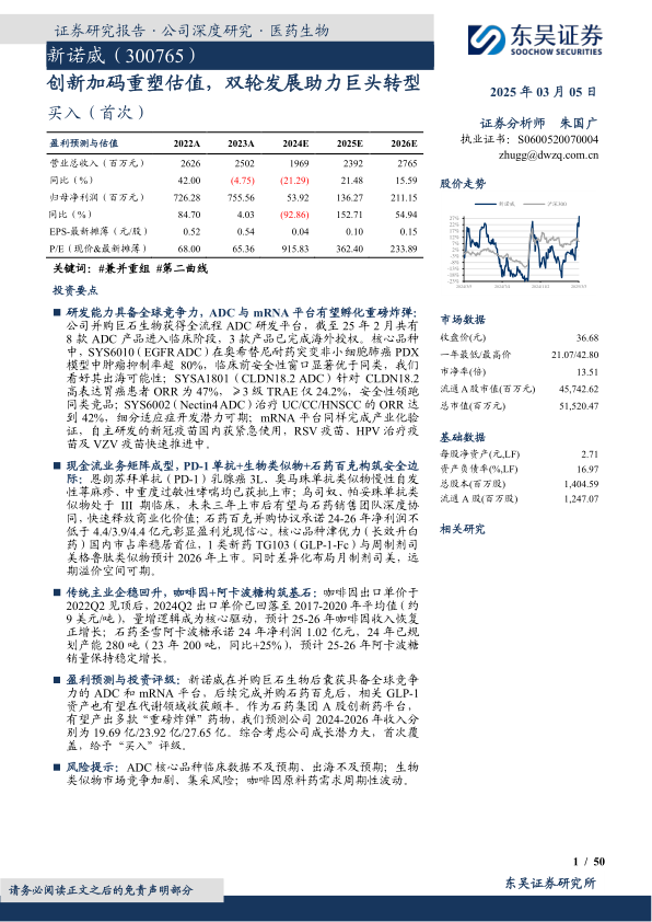 新诺威正通过一系列前瞻性的战略并购和持续的研发投入,成功从传统功能性食品原料企业转型为创新生物制药平台。公司在ADC、mRNA疫苗、PD-1、生物类似药和GLP-1等前沿领域构建了多元化且具有竞争力的产品管线,其中多款核心产品已进入临床后期或已上市,展现出巨大的商业化潜力。同时,其传统的功能性原料药和保健食品业务继续提供稳健的盈利和现金流支持,为创新业务的发展奠定了坚实基础。在石药集团的全面赋能下,新诺威有望凭借其技术优势、市场布局和商业化能力,实现创新药业务的快速放量,并产出多款“重磅炸弹”药物,从而重塑公司估值,实现长期可持续的增长。鉴于公司巨大的成长潜力,首次覆盖给予“买入”评级。
