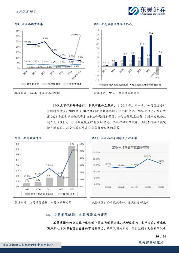 公司实际控制人为石药集团董事长蔡东晨,股权结构稳定。高管团队经验丰富,多来自石药集团及旗下子公司。石药集团作为中国龙头制药企业,在研发(8大创新研发平台、5大研发中心、2000+研发人员、300+在研项目)、生产(10+生产基地,覆盖纳米制剂、生物药、化药、mRNA疫苗)和商业化(10000+专业营销团队,覆盖35000+医疗机构和350000+药店,产品出口110+国家)方面具备强大实力。新诺威将深度受益于集团的全面赋能,加速新药研发和商业化进程。在转型前,公司财务表现稳健,2018-2023年收入CAGR为15.07%,利润CAGR为27.54%。2023年实现收入25.02亿元,归母净利润7.56亿元。公司费用控制能力良好,经营性现金流充裕,2018-2023年累计经营性现金净流入高达26.9亿元,账上货币资金充足,为创新转型奠定了坚实基础。