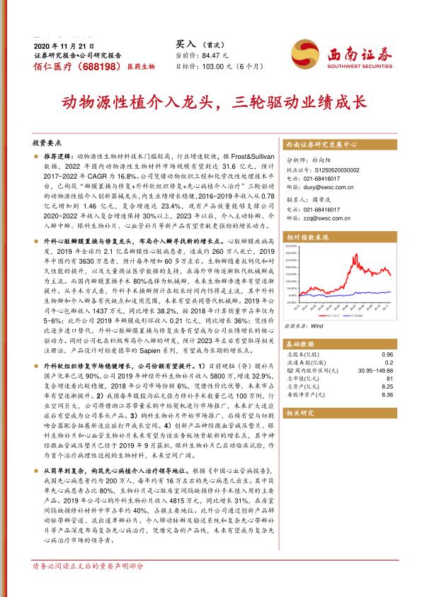 盈利预测与投资建议。 由于瓣膜置换与修复产品和心胸外科生物补片高速增长,以及部分新品放量驱动,预计公司 2020~2022 年收入分别为 1.8、 2.3、 3 亿元,由于股权激励摊销,预计归母净利润分别为 0.55、0.51、1.11 亿元,若剔除股权激励影响,内生业绩增长稳健,预计 2021 年约 1.1 亿元内生净利润,参考可比公司给予 2021 年 90 倍 PE 估值,对应合理市值为 99 亿元,目标价 103 元/股。首次覆盖,给予“买入”评级。