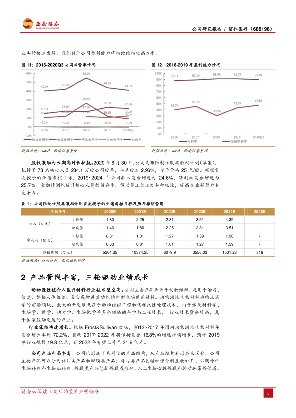 推荐逻辑: 动物源性生物材料技术门槛较高, 行业增速较快, 据 Frost&Sullivan数据,2022 年国内动物源性生物材料市场规模有望到达 31.6 亿元,预计2017~2022 年 CAGR 为 16.8%。 公司凭借动物组织工程和化学改性处理技术平台,已构筑“瓣膜置换与修复+外科软组织修复+先心病植介入治疗”三轮驱动的动物源性植介入创新器械龙头, 内生业绩增长稳健, 2016~2019 年收入从 0.78亿元增加到 1.46 亿元,复合增速达 23.4% ,现有产品放量能够支撑公司2020~2022 年收入复合增速保持 30%以上,2023 年以后,介入主动脉瓣、介入瓣中瓣、眼科生物补片、心血管补片等新产品有望贡献更强劲的增长动力。