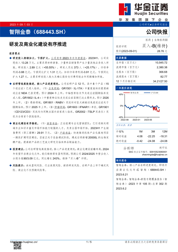 本报告分析了智翔金泰2023年半年度报告,指出公司在加大研发投入的同时,积极推进商业化建设,核心产品在研进度领先。公司在自免、感染和肿瘤领域均有重要产品布局,并预计在2024年开启商业化元年。维持对公司的“买入-B”评级,但同时也提示了公司面临的多种风险,包括尚未盈利、政策变动、研发失败以及商业化不及预期等。